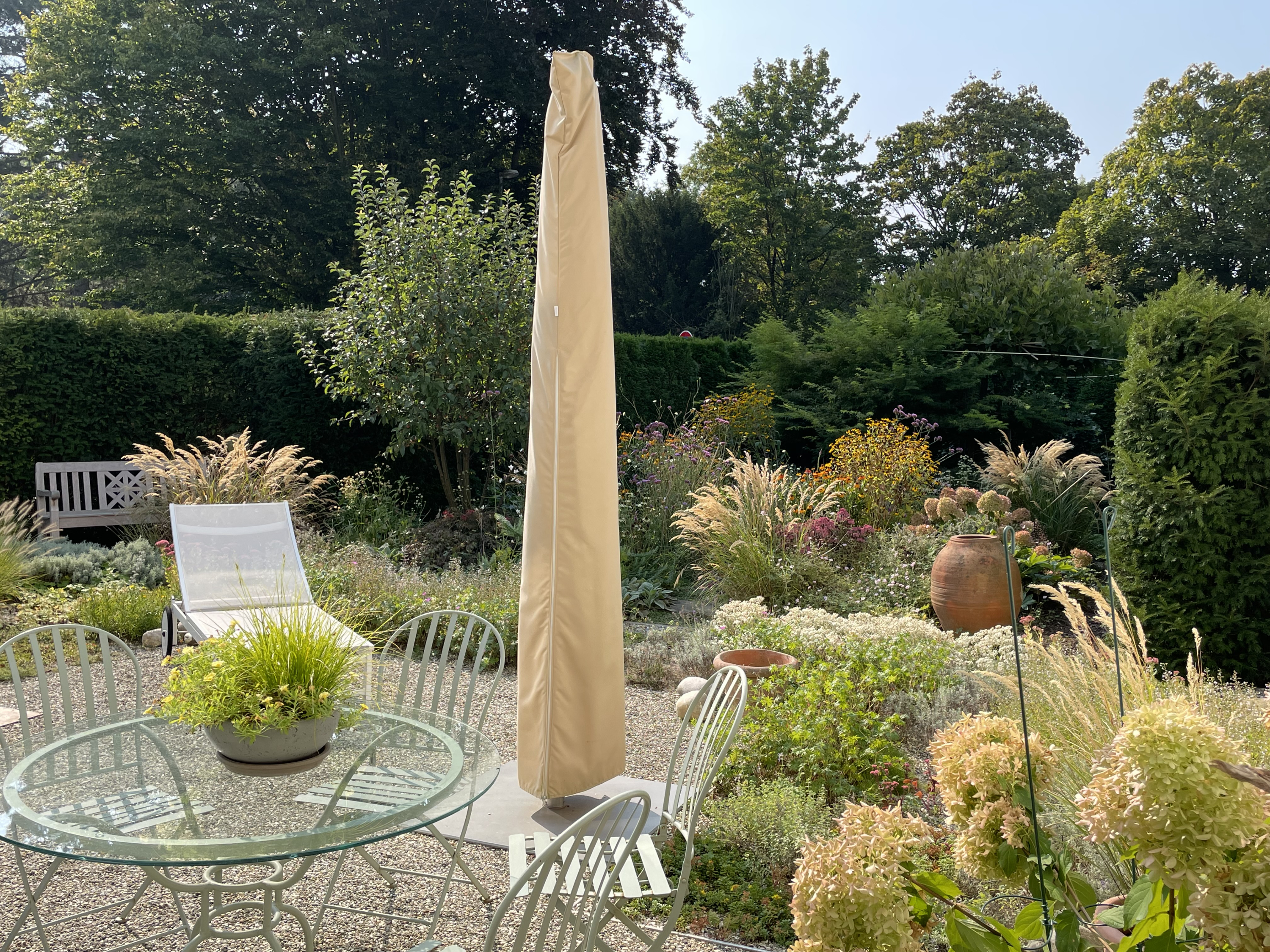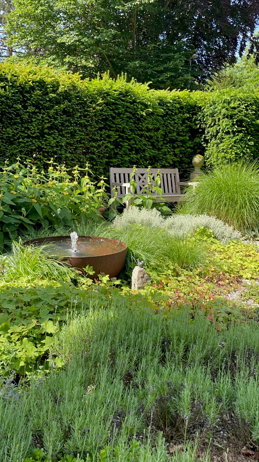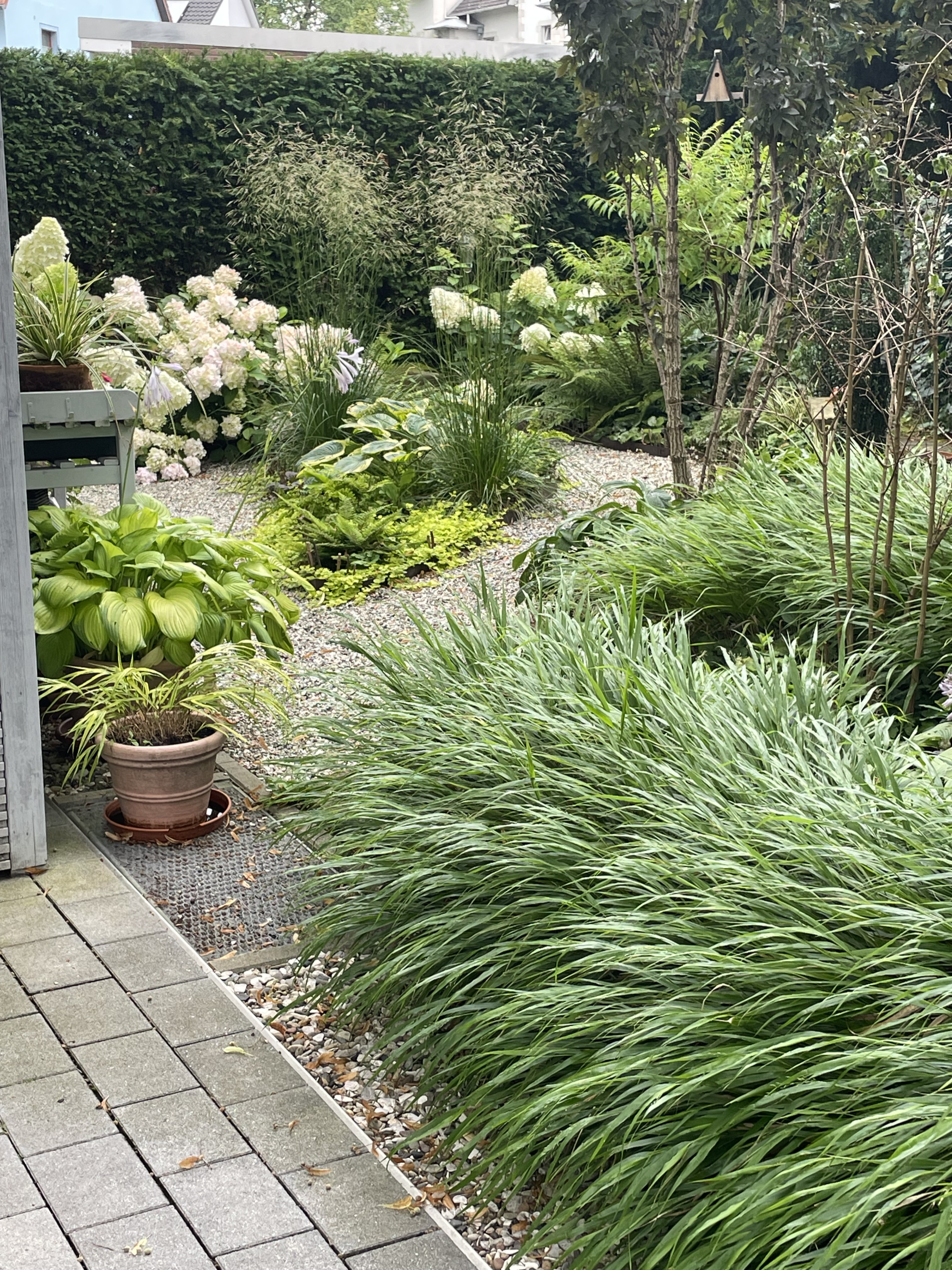 Kleines Refugium hinter hohen Hecken. Ein vielfältiges Gärtchen, kein Rasen, dafür Kies, Stauden und Gehölze, teilweise bepflanztes Tiefgaragendach. Zugang: Wiegmannstraße gegenüber Haus Nr. 2.