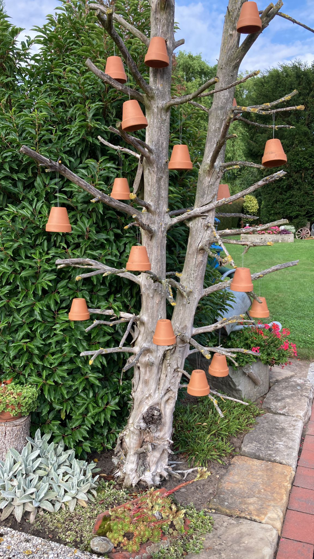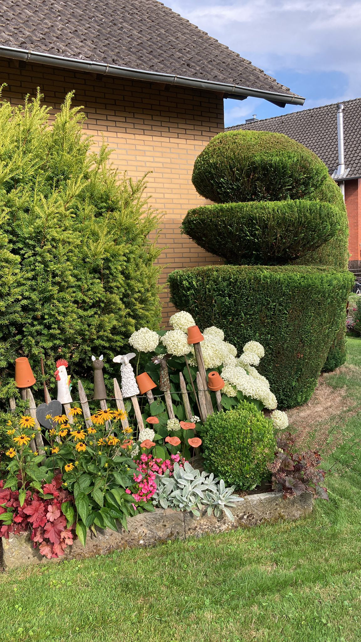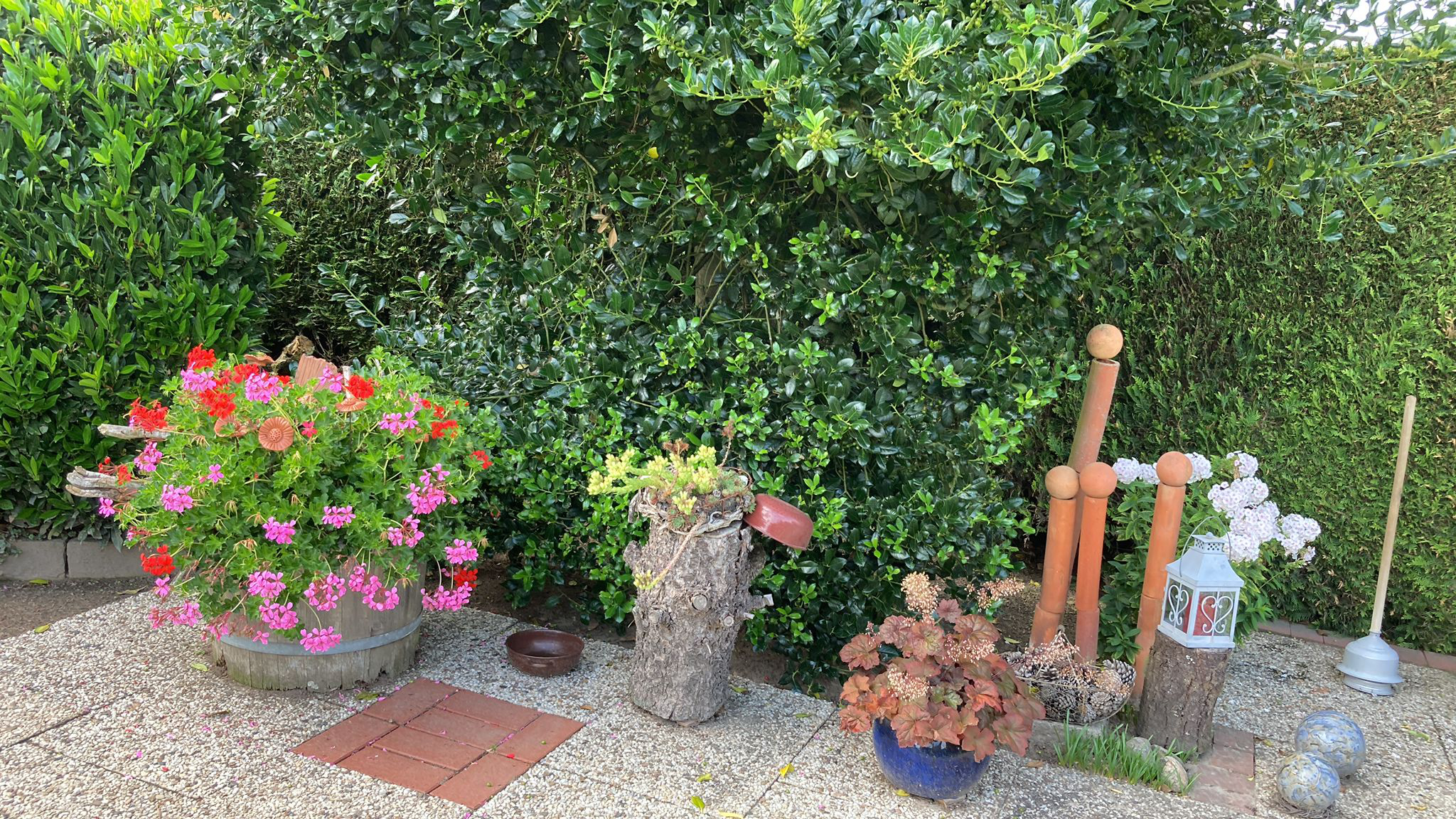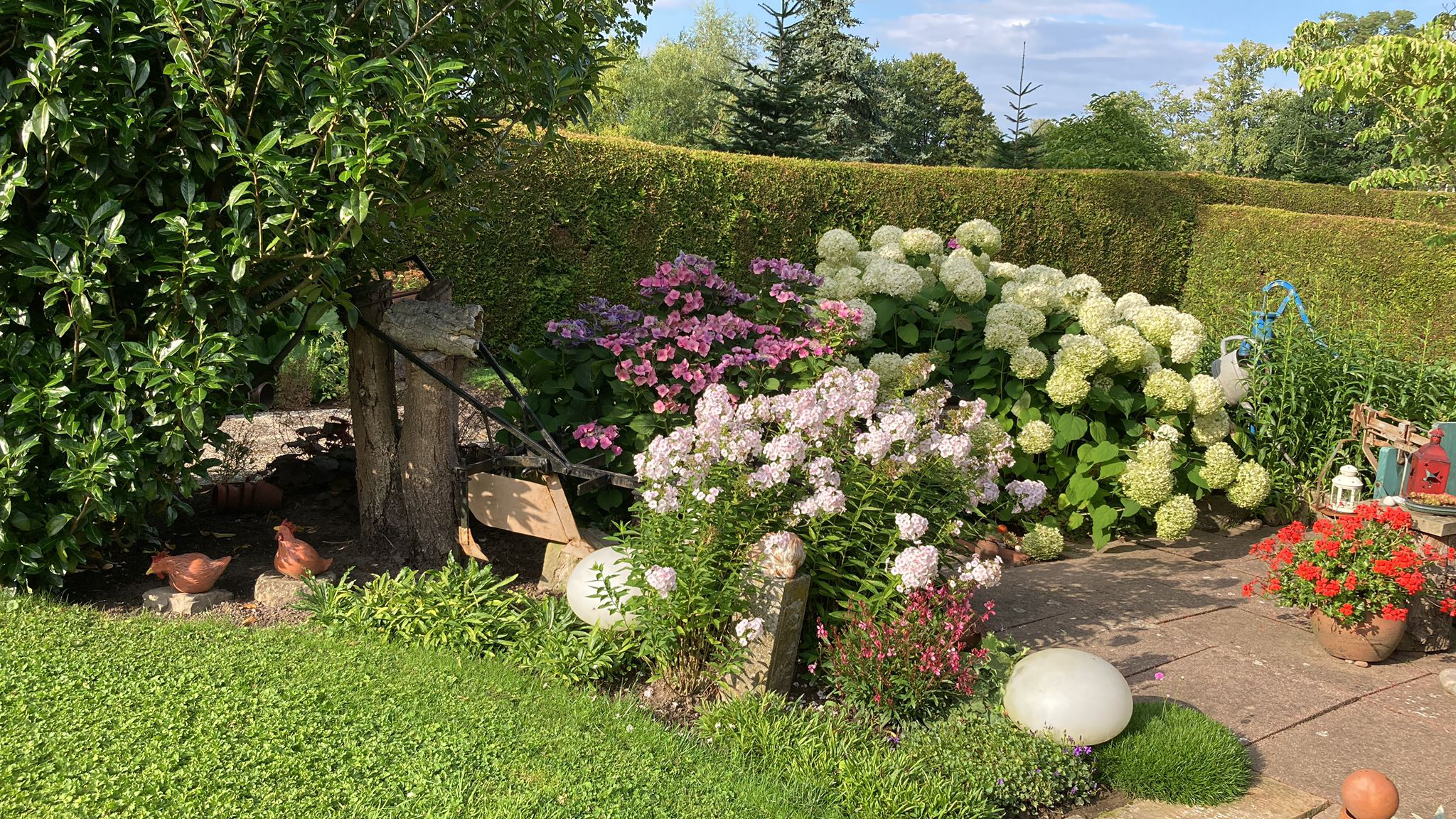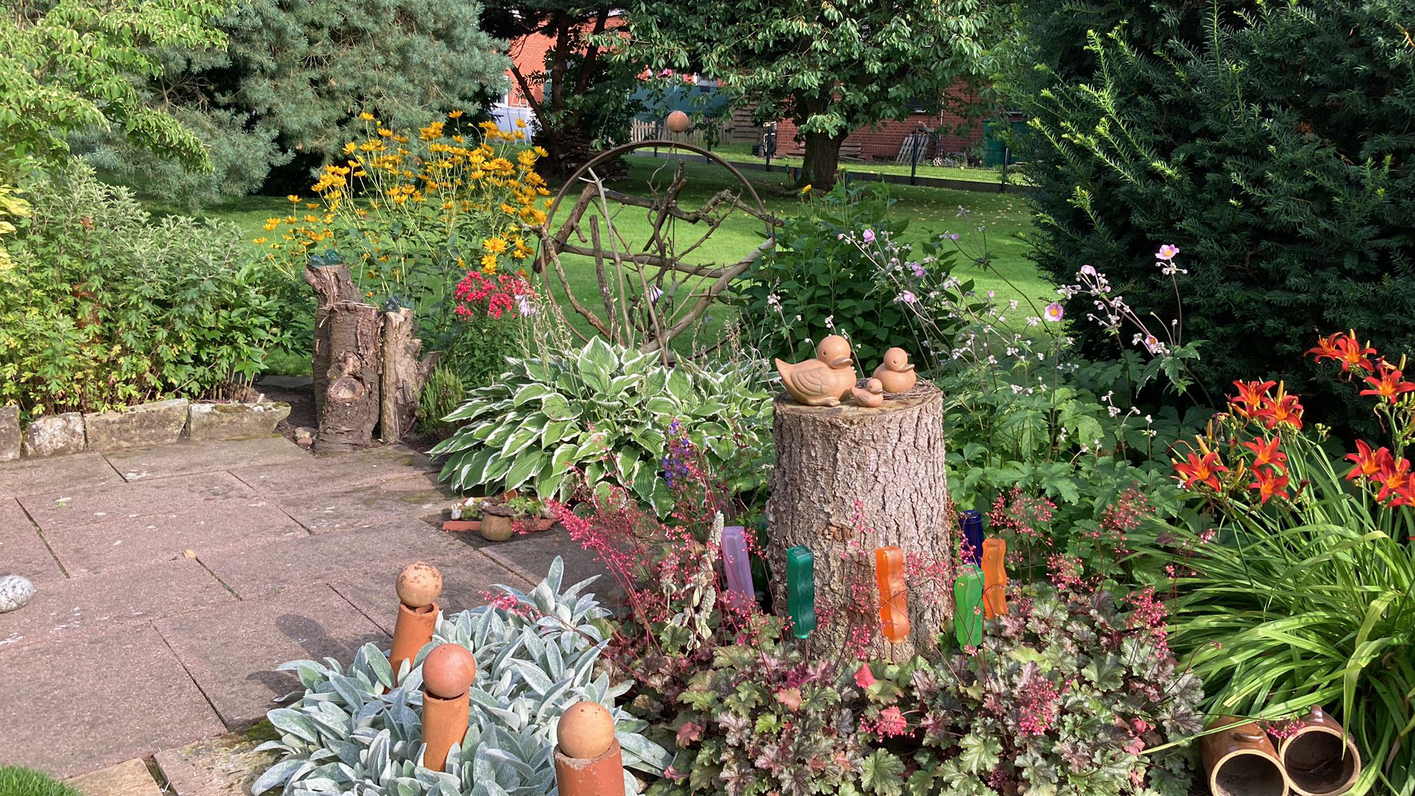 Ein liebevoll gestalteter Garten mit Blumen und Deko rings ums Haus.