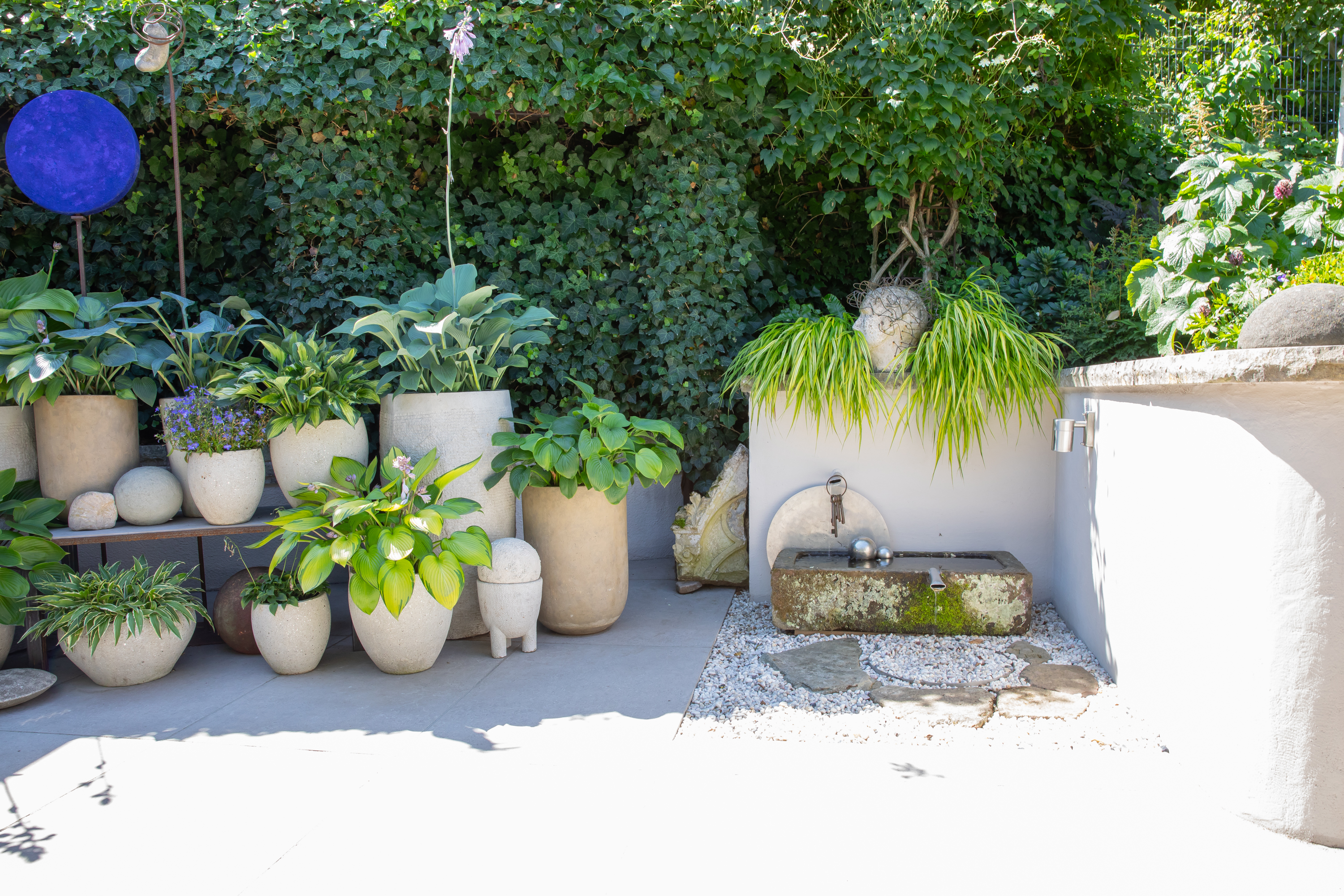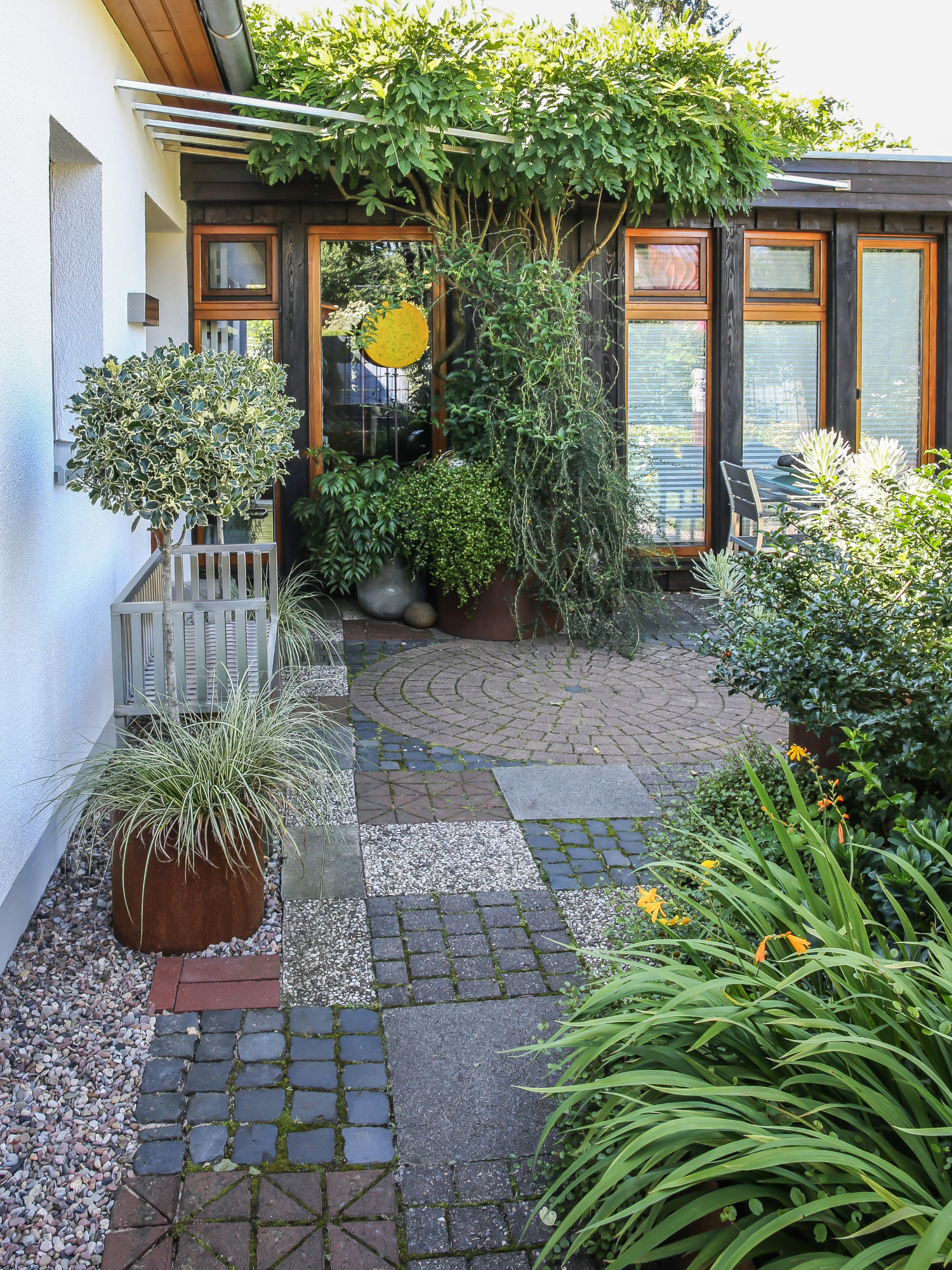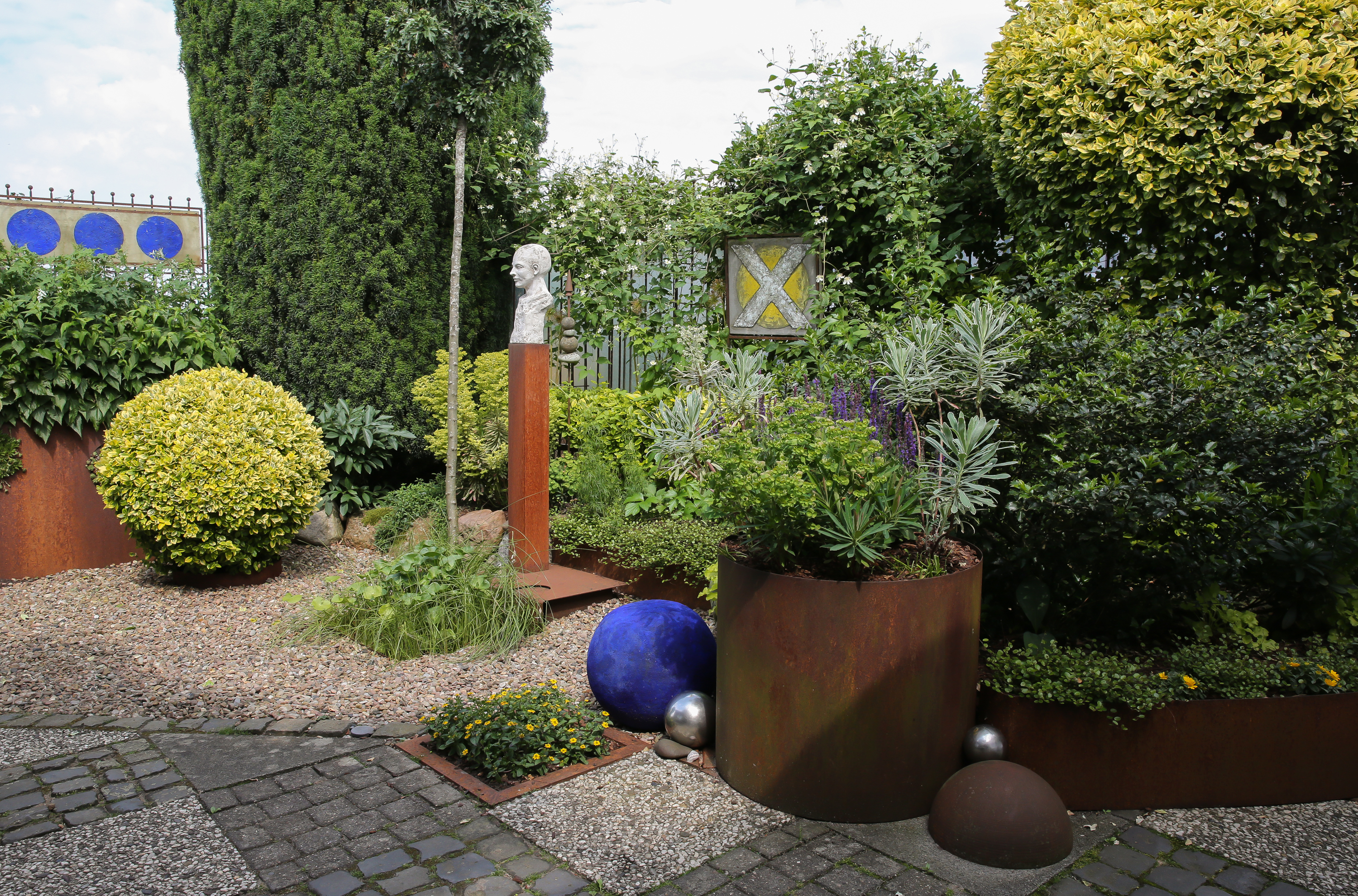 GARTEN & KUNST. Kleine Gartenräume ohne Rasen, Kunst im Haus. Hochbeete, Wasserbecken aus rostigem Stahl und Naturstein, ungewöhnliche Rankelemente, farbige Kunstobjekte zu Clematis, Stauden, Hosta und Gräsern.