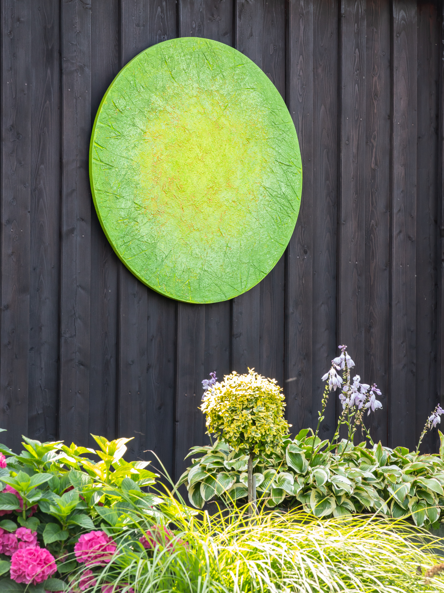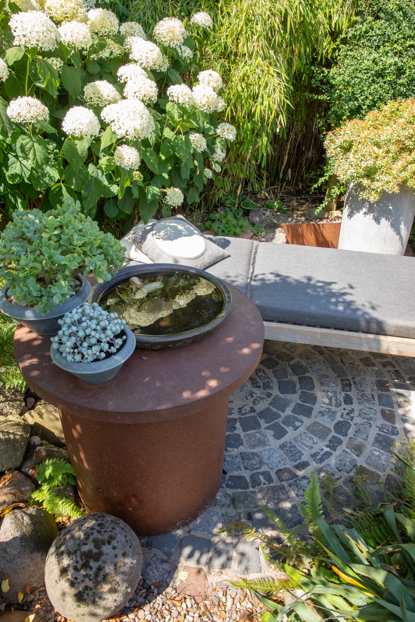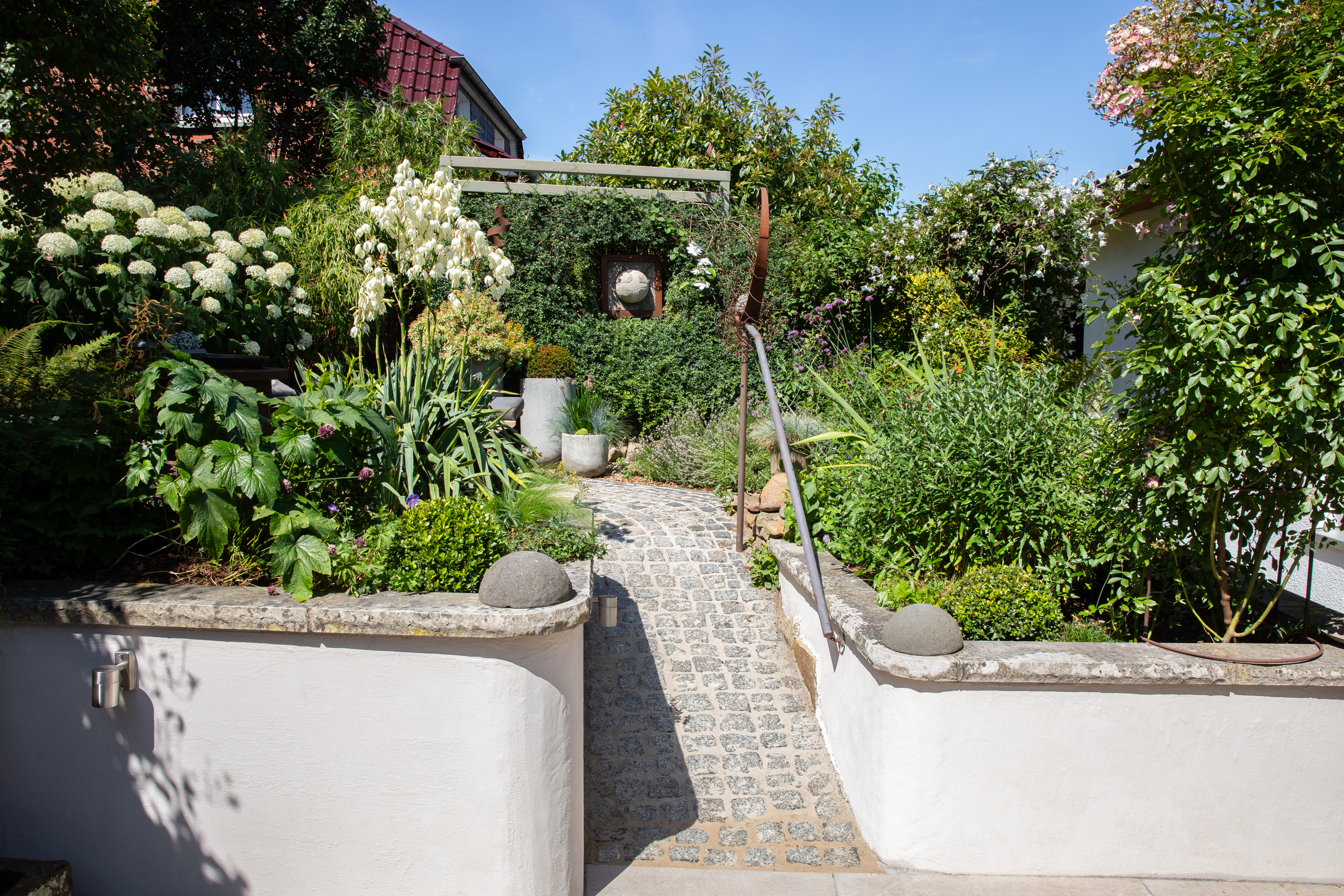 GARTEN & KUNST. Kleine Gartenräume ohne Rasen, Kunst im Haus. Hochbeete, Wasserbecken aus rostigem Stahl und Naturstein, ungewöhnliche Rankelemente, farbige Kunstobjekte zu Clematis, Stauden, Hosta und Gräsern.