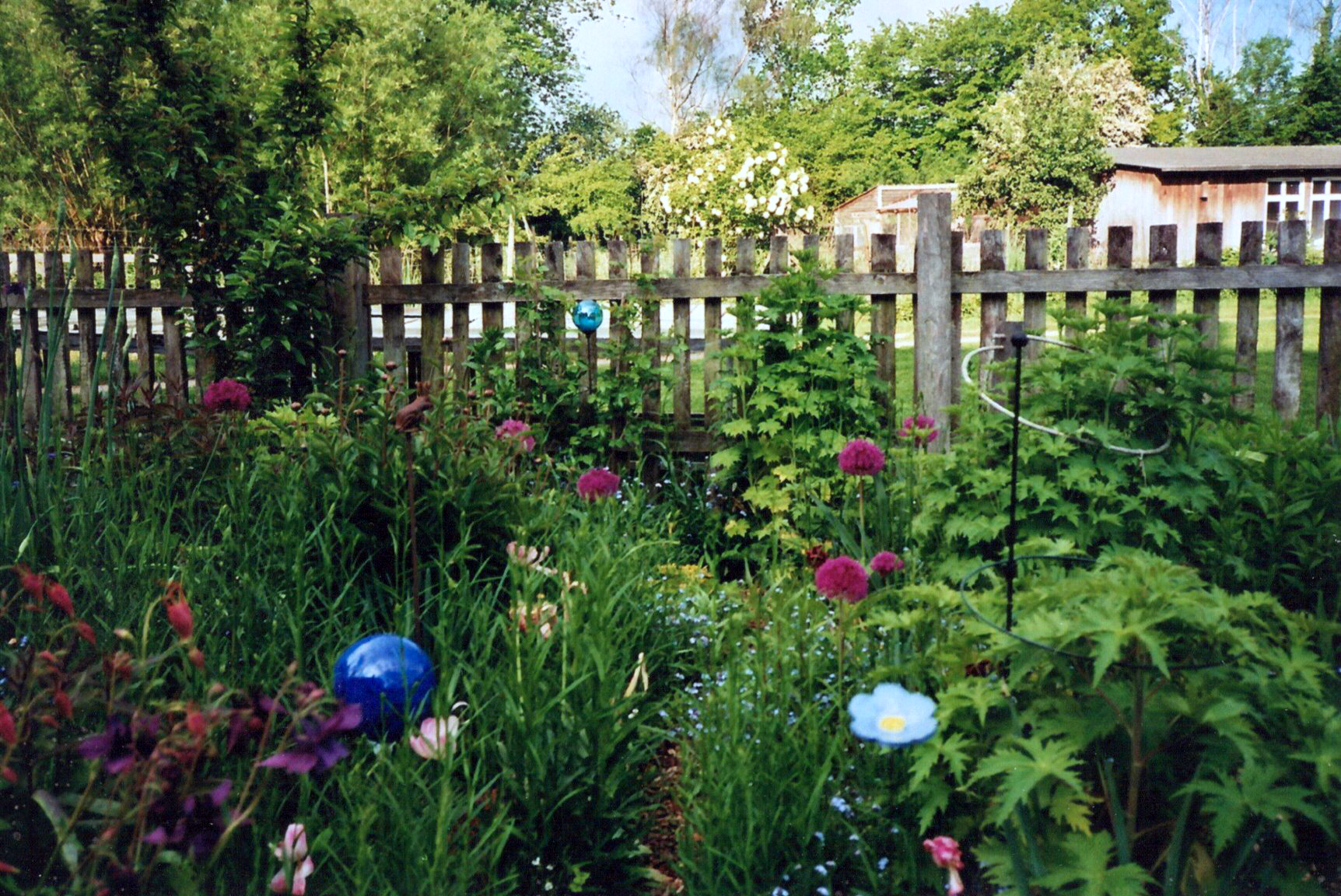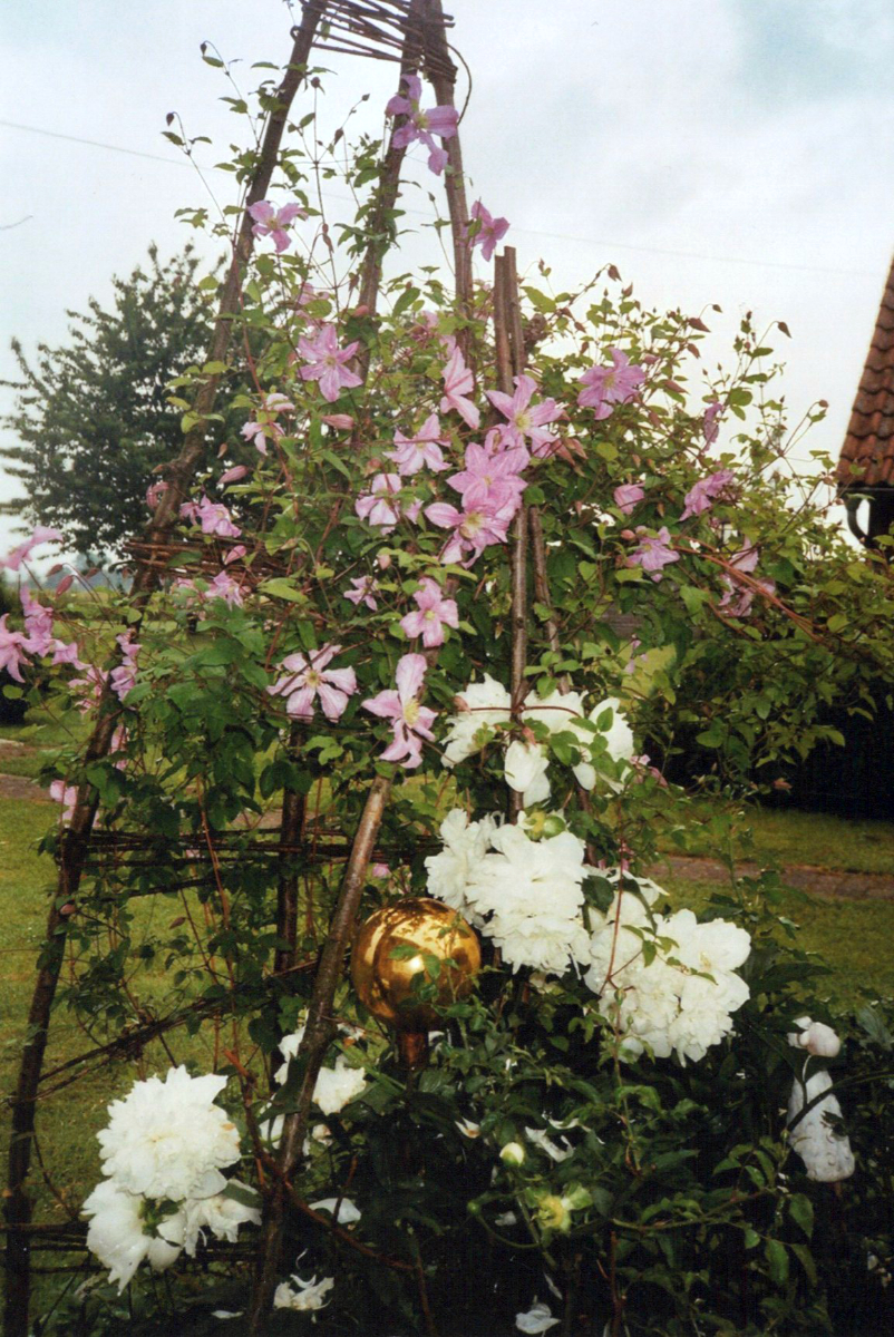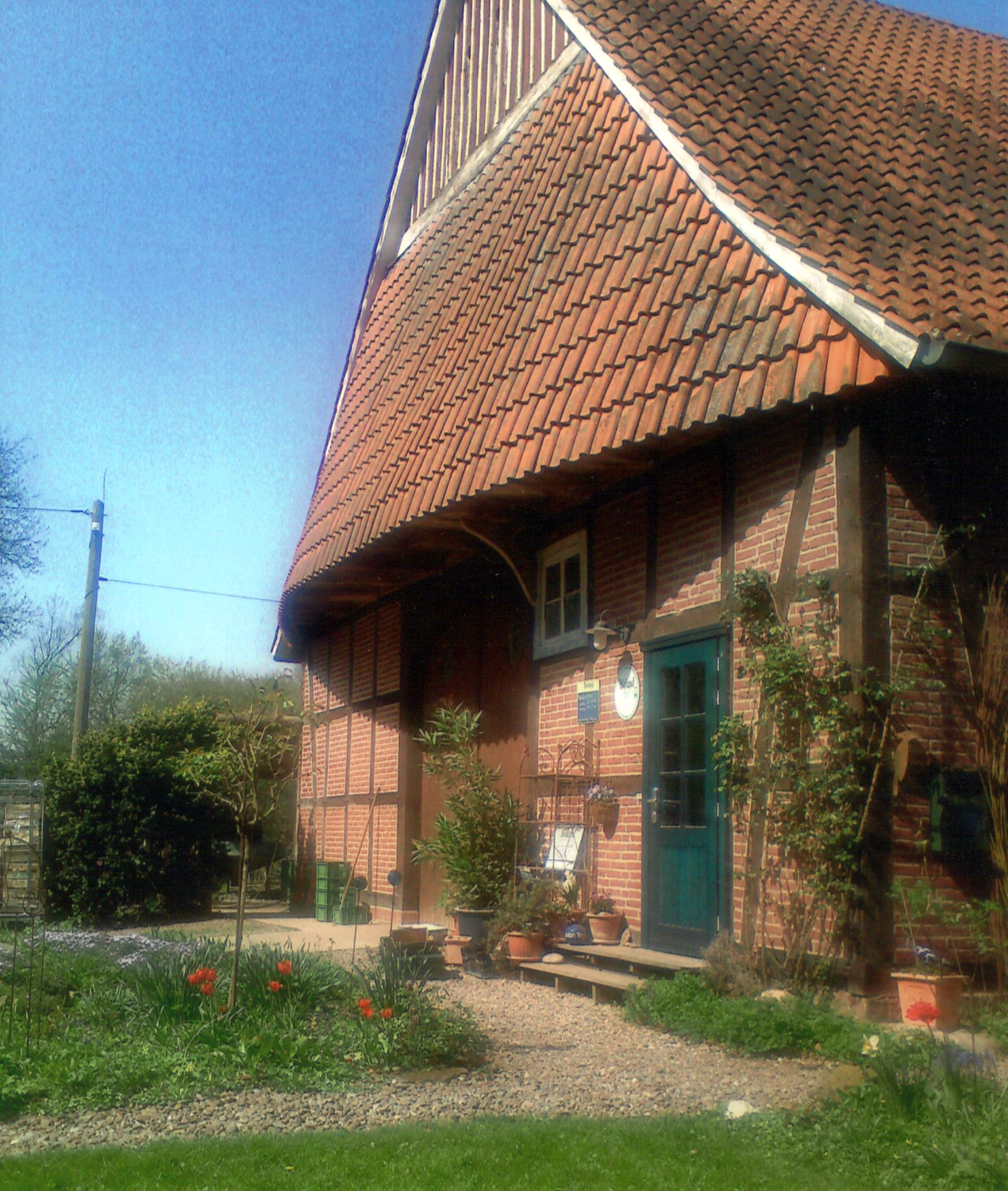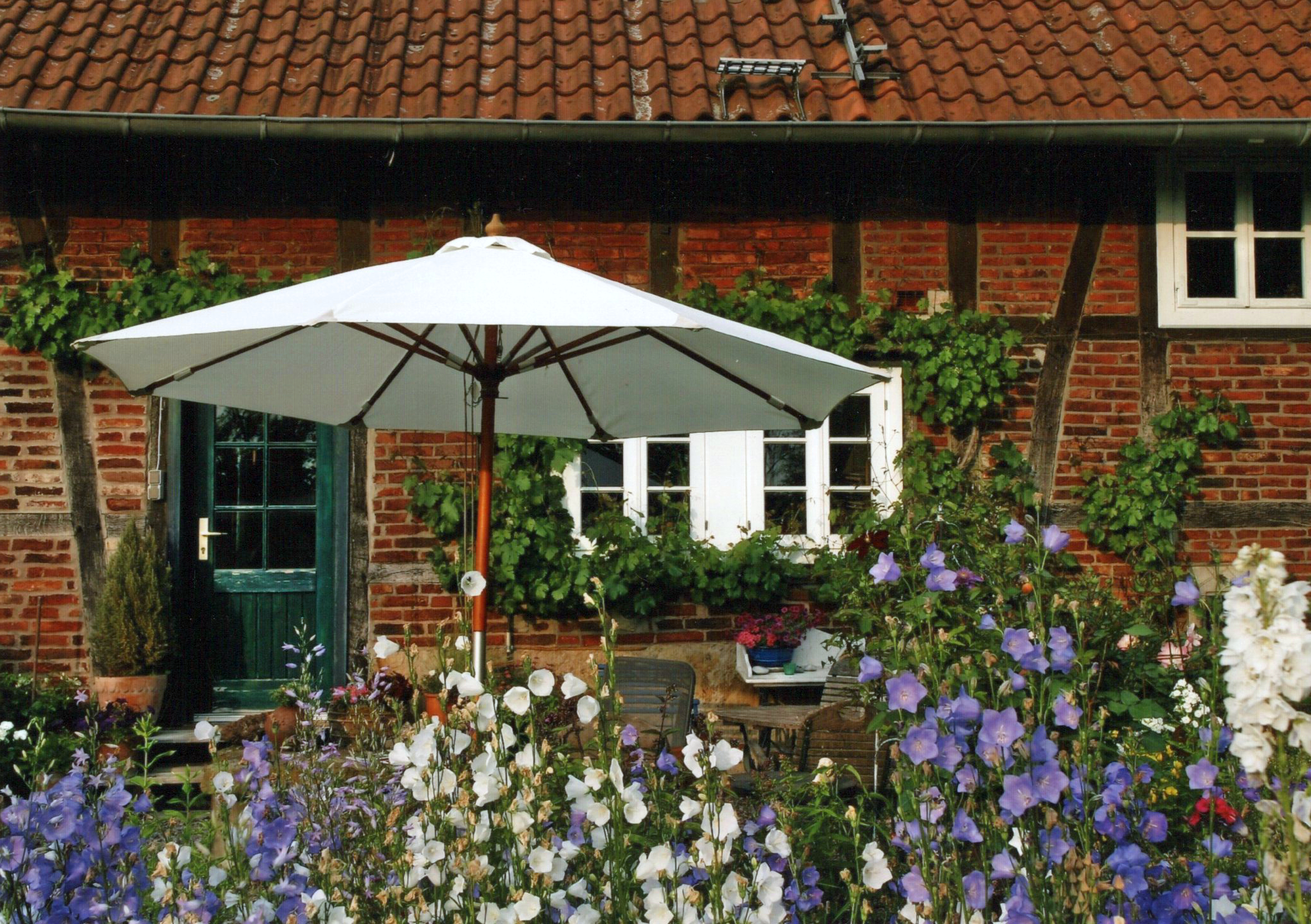Staudengarten im Sommer mit Phlox, Sonnenhüten… rund um unsere denkmalgeschützten Häuser auf dem Rethof außerhalb von Scheie. Ausblicke in die Bückeburger Niederung und auf die Storchennester in den Bäumen am Waldrand.